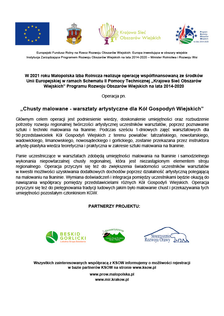 Stowarzyszenie Lokalna Grupa Działania "Beskid Gorlicki" uczestniczy w realizacji projektu pn. "Ewaluacja zewnętrzna małopolskich lokalnych strategii rozwoju". Operacja pn. „Ewaluacja zewnętrzna małopolskich lokalnych strategii rozwoju” ma na celu identyfikację i ocenę efektów realizacji lokalnych strategii rozwoju 2014-2020 w województwie małopolskim zakończoną opracowaniem narzędzia wspierającego zarządzanie strategiczne lokalnych grup działania poprzez przeprowadzenie ewaluacji zewnętrznej w okresie maj-październik 2021 r., współfinansowana jest ze środków Unii Europejskiej w ramach Schematu II Pomocy Technicznej „Krajowa Sieć Obszarów Wiejskich” Programu Rozwoju Obszarów Wiejskich na lata 2014-2020. Przewidywane wyniki operacji: opracowanie narzędzia dla 32 małopolskich lokalnych grup działania wspierającego zarządzanie strategiczne i prowadzenie polityki opartej na wiedzy, wykorzystującej doświadczenia z zakończonych interwencji.