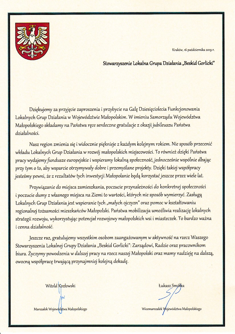 16 października 2019 roku w Muzeum Lotnictwa Polskiego w Krakowie odbyła się uroczysta Gala z okazji jubileuszu 10-lecia funkcjonowania Lokalnych Grup Działania, zorganizowana przez Samorząd Województwa Małopolskiego. W trakcie uroczystości wicemarszałek Łukasz Smółka i Iwona Gibas, wiceprzewodnicząca sejmiku województwa małopolskiego wręczyli pisemne podziękowania i gratulowali obecnym reprezentantom LGD.