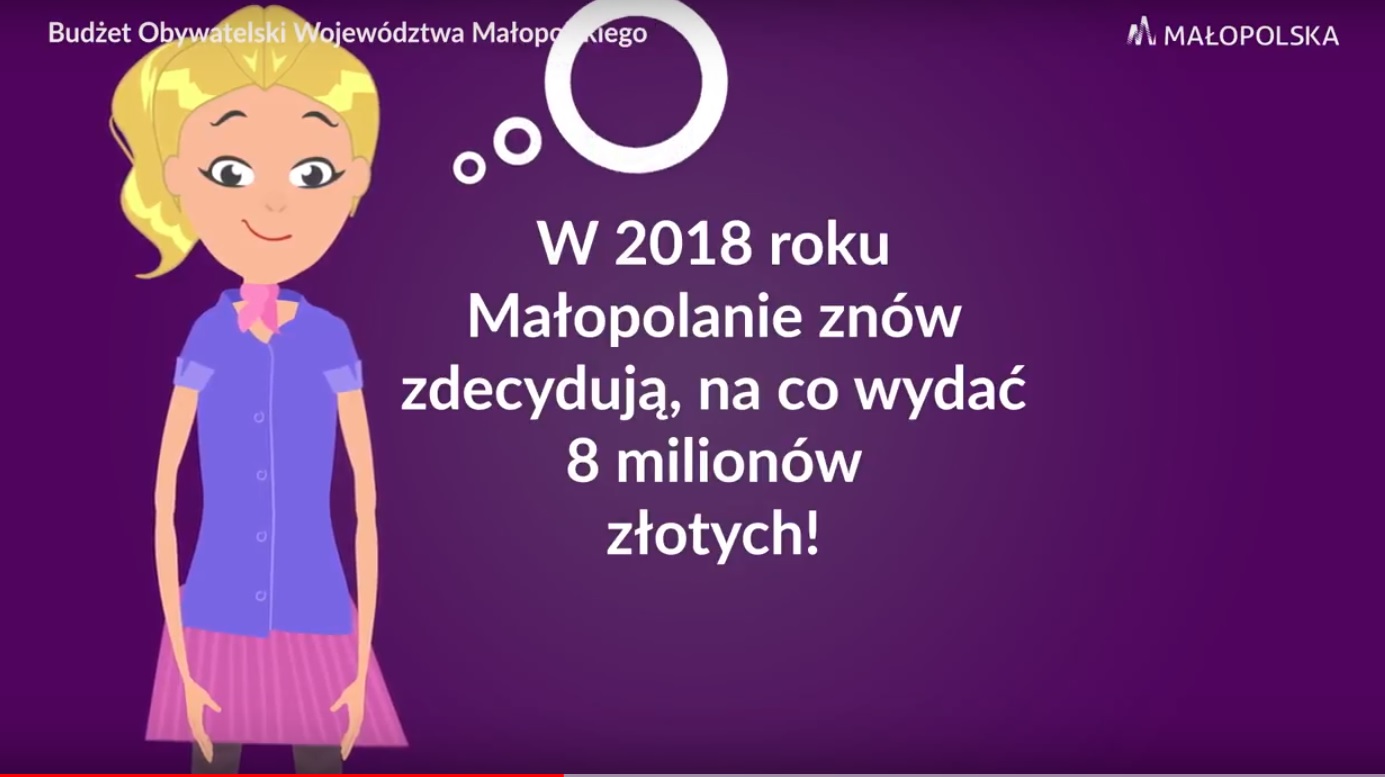 W ramach 3. Edycji Budżetu Obywatelskiego. W 2018 r., do dyspozycji mieszkańców Zarząd Województwa Małopolskiego przeznaczył 8 milionów złotych na realizację pomysłów Małopolan. Listę zadań dopuszczonych do głosowania poznamy najpóźniej 31 sierpnia br.