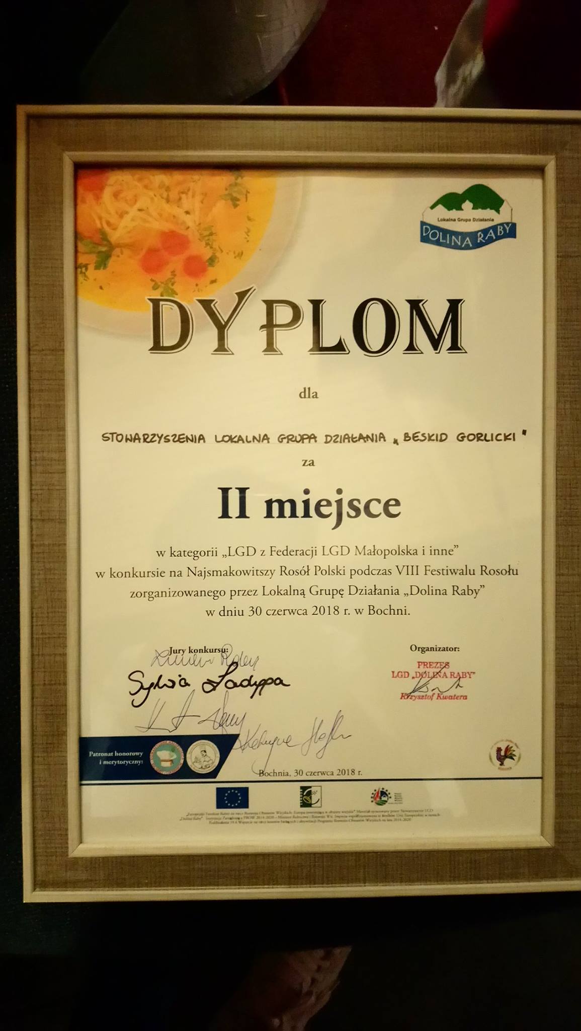 30.06.2018 Stowarzyszenie Lokalna Grupa Działania "Beskid Gorlicki" brało udział w organizowanym w Bochni przez Lokalną Grupę Działania Dolina Raby w VIII Festiwalu Rosołu. Za sprawą Pań ze Stowarzyszenia Kobiet Szalowskich "Szalowianki" zdobyliśmy II miejsce w konkursie na najsmaczniejszy rosół.