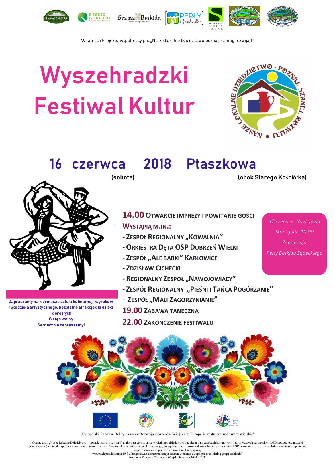 Stowarzyszenie LGD „Beskid Gorlicki” wraz z partnerami projektu współpracy „Nasze Lokalne Dziedzictwo - poznaj, szanuj, rozwijaj!” zaprasza 17 czerwca br. (niedziela) do udziału w Wyszehradzkim Festiwalu Kultur w Nawojowej.