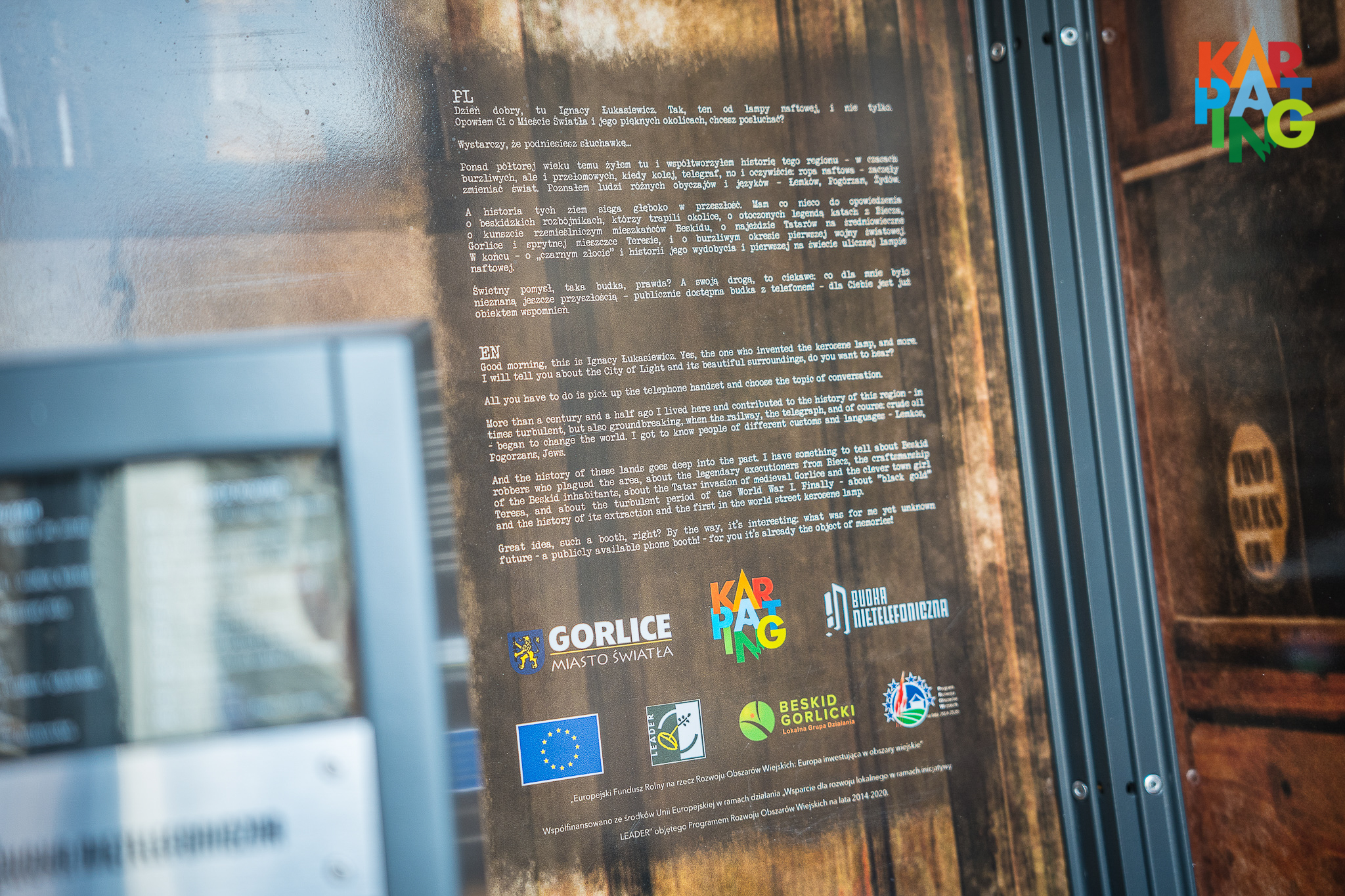 To kreatywna instalacja artystyczna – zrewitalizowana i przearanżowana budka telefoniczna. Podnosząc słuchawkę poznacie wiele ciekawych historii, których na próżno szukać w Wikipedii – legendy, zakulisowe wątki rozmaitych zaszłości i to w dodatku „z pierwszej ręki”, bo przedstawione przez samego Ignacego Łukasiewicza, z którym połączycie się osobiście za pośrednictwem tegoż, jakże wdzięcznego wehikułu czasu. Zapraszamy w podróż po Beskidzie Gorlickim!
